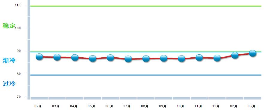 四项分项景气指数环比2月均有上升,出口指数上升幅度较大,其中:营业收入景气指数88.53,位于“渐冷”区间,较2月回升0.24点;出口景气指数为99.11,位于“稳定”区间,较2月上升4.17点;资产景气指数为89.49,位于“渐冷”区间,较2月回升0.97点;利润景气指数85.57,位于“渐冷”区间,较2月上升1.12点。
