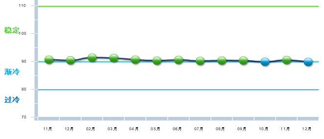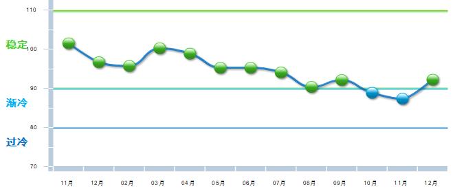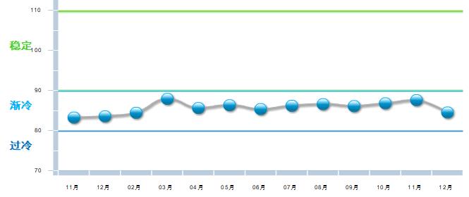 中国轻工业经济运行及预测预警系统数据显示:2019年,中轻景气指数继续在蓝色“趋冷”区间波动,全年呈震荡下行走势。12月中轻景气指数为85.76,较11月下降0.85点,较去年同月下降1.71点。