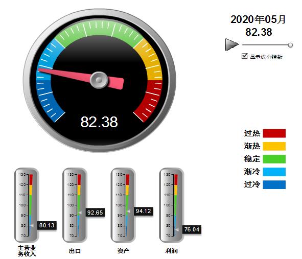 分项景气指数中,营业收入、利润景气指数环比上升,出口景气指数环比下降。其中:营业收入景气指数80.13,位于“渐冷”区间,环比上升2.09点;出口景气指数为92.65,位于“稳定”区间,环比下降4.68点;资产景气指数为94.12,位于“稳定”区间,环比持平;利润景气指数76.04,位于“过冷”区间,环比上升8.15点。