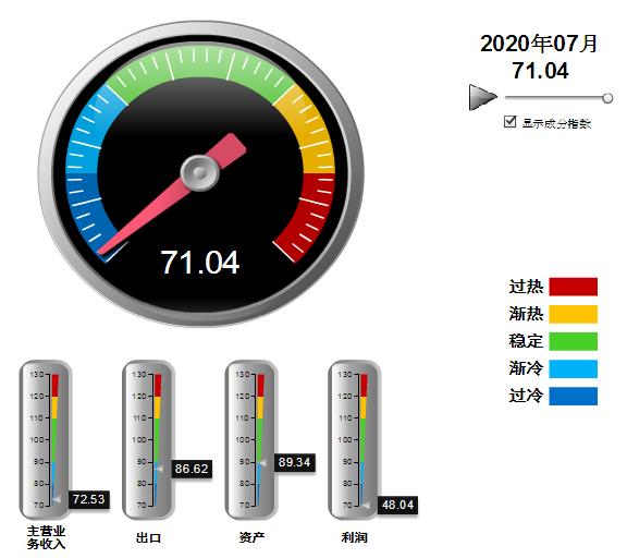 分项景气指数中,营收、出口、利润景气指数环比上月回升,资产景气指数小幅下降。其中:营业收入景气指数72.53,位于“过冷”区间,环比上升1.57点;出口景气指数为86.62,位于“趋冷”区间,环比上升0.01点;资产景气指数为89.34,位于“趋冷”区间,环比下降0.69点;利润景气指数48.04,位于“过冷”区间,环比上升11.77点。