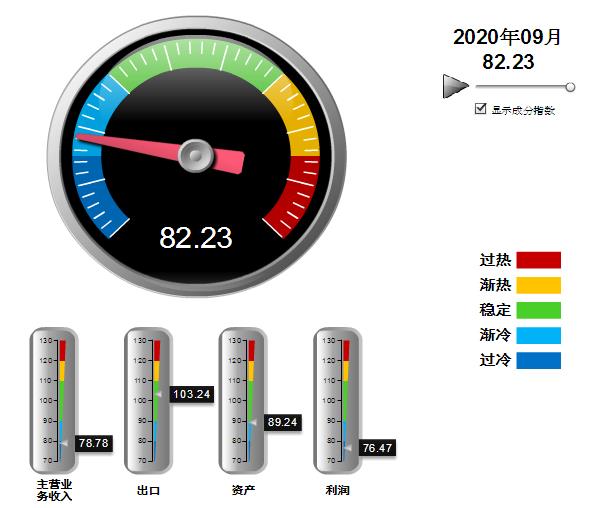 四项分项景气指数环比上月均有上升,出口、利润指数上升幅度较大。其中:营业收入景气指数78.78,位于“过冷”区间,环比上升1.27点;出口景气指数为103.24,位于“稳定”区间,环比上升2.74点;资产景气指数为89.24,位于“渐冷”区间,环比上升0.21点;利润景气指数76.47,位于“过冷”区间,环比上升3.17点。