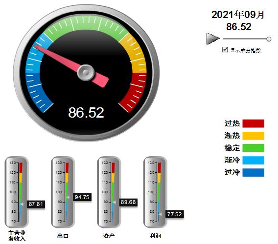 四项分项景气指数环比上月均有下降,其中:营业收入景气指数87.81,位于“渐冷”区间,环比下降0.86点;出口景气指数为94.75,位于“稳定”区间,环比下降4.64点;资产景气指数为89.68,位于“渐冷”区间,环比下降0.8点;利润景气指数77.52,位于“过冷”区间,环比下降1.28点。