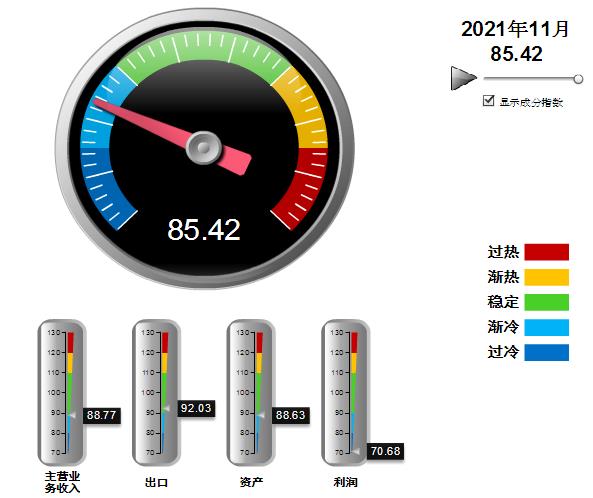 分项景气指数中,营收、利润出口指数环比上月均有上升,利润指数上升幅度较大,资产指数小幅下降,其中:营业收入景气指数88.77,位于“渐冷”区间,环比上升0.12点;出口景气指数为92.03,位于“稳定”区间,环比上升0.26点;资产景气指数为88.63,位于“渐冷”区间,环比下降0.37点;利润景气指数70.68,位于“过冷”区间,环比上升2.17点。