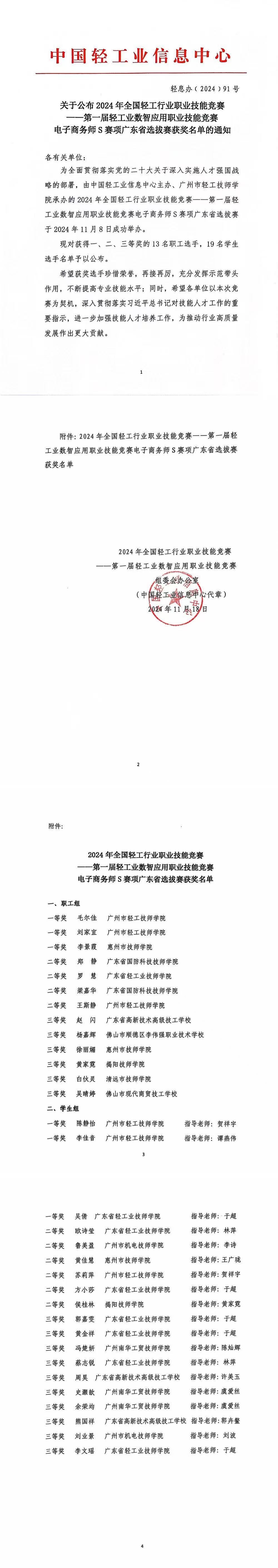 关于公布2024年全国 职业技能竞赛——第一届轻工业数智应用职业技能竞赛电子商务师赛项广东省选拔赛获奖名单的通知