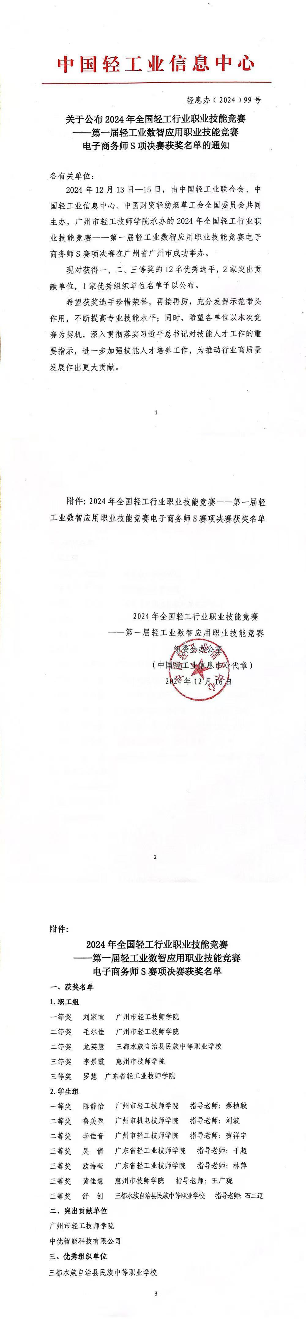 关于公布2024年全国 职业技能竞赛——第一届轻工业数智应用职业技能竞赛电子商务师S决赛获奖名单的通知
