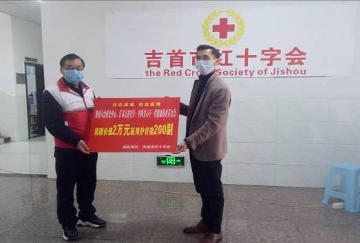 湖南省眼镜商会常务副会长单位湘西大众视光中心 (党支部)匡敬群总经理2月3日下午联合江苏点进光学通过中国关心下一代健康体育基金会向吉首市红十字会捐赠价值2万元医用护目镜200副。(其中180副医用护目镜捐赠给吉首市人民医院一线医护人员,20副护目镜和40瓶镜片消毒液赠送给吉首市电视台在一线采访的记者。)