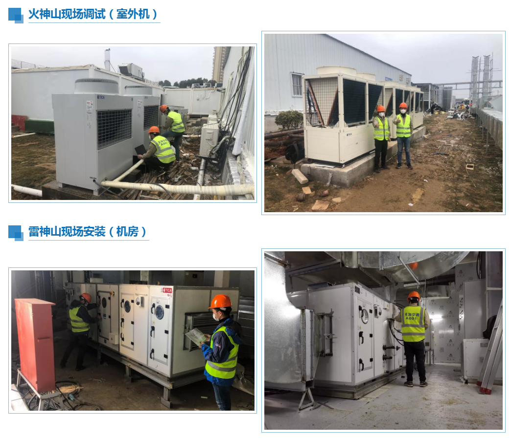 天加向两家医院的ICU、负压病房、检验室等核心净化区域捐赠的14台套专业医用净化空调设备已完成了安装调试工作。其中火神山医院的净化空调设备已开始工作,运转良好。