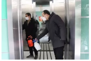 ▲杜晓波(右)带人在进行电梯消杀