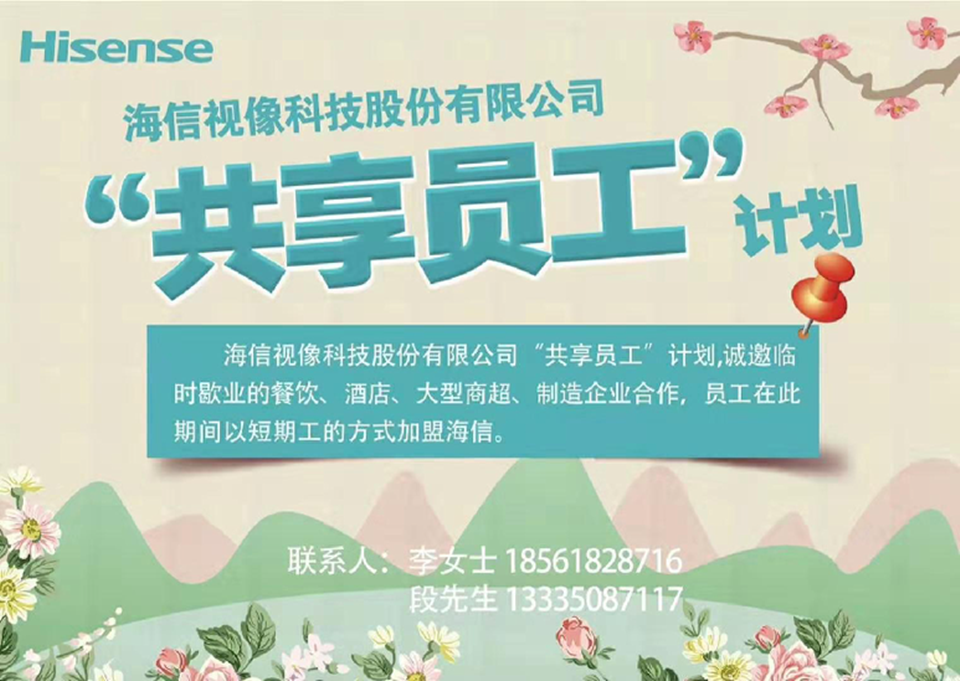 2月11日,海信视像科技股份有限公司推出“共享员工”计划,邀请临时歇业的餐饮、酒店、大型商超、制造企业员工,以短期工的方式加盟海信,共同渡过“非常时期”。