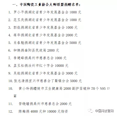 指导下,第一时间发起倡议,陶瓷行业各省地市协会及企业积极响应,积极为武汉及各地抗击疫情提供紧需物资,贡献了行业力量。