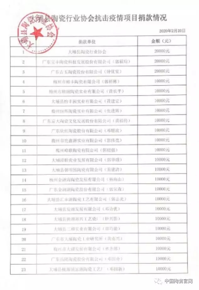 广东大埔县陶瓷行业协会在2月9日向会员单位发起倡议,积极弘扬团结互助的伟大精神,共克时艰、共抗疫情,截止到2月20日共筹到捐款365000元,将用于统一采购防护物资。
