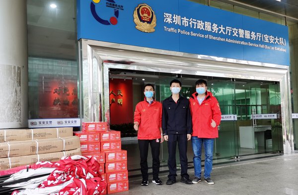 深圳红牛看到消息后立即行动,一方面协调总部及合作伙伴,将平日用于市场活动的大雨伞和四角帐篷数量全部统计出来;一方面与深圳交警沟通具体捐赠和接收事宜。2月13日下午3时,这批物资(共计500把大伞、50顶四角帐篷、200箱功能饮料)在深圳市公安局交通警察支队完成捐赠手续。