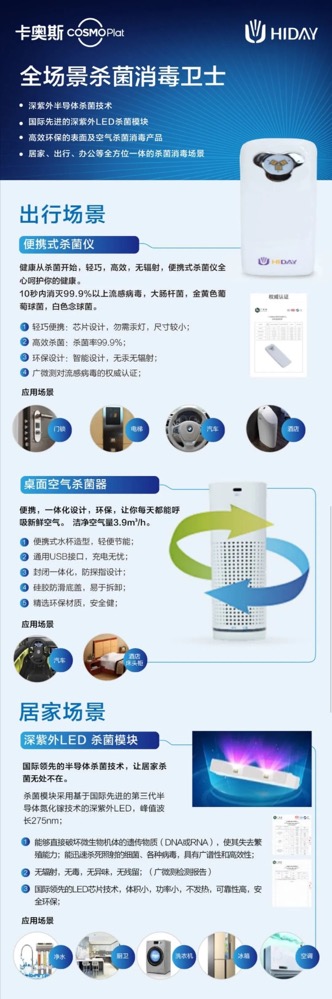卡奥斯COSMOPlat旗下HIDAY推出全场景杀菌消毒卫士,运用深紫外半导体杀菌技术,搭载国际先进的深紫外LED杀菌模块,可提供居家、出行、办公等场景下,实施全方位一体杀菌消毒。