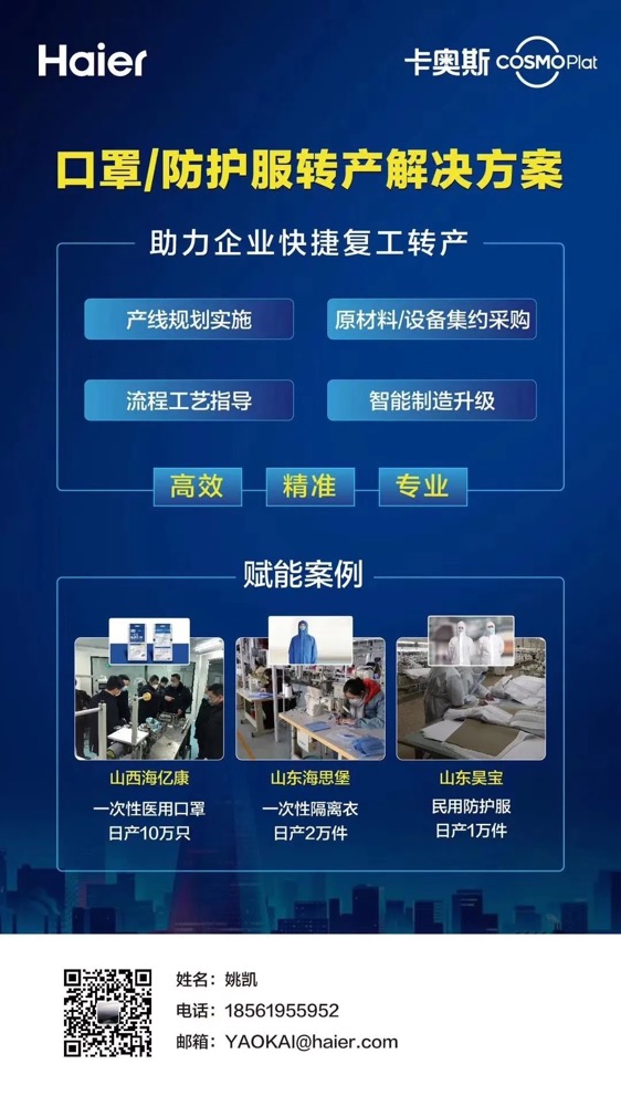 卡奥斯COSMOPlat已汇聚企业复工转产所需的规划、设备、原材料、技术指导等全方面资源支持,不仅可以快速实现隔离衣、防护服的生产,而且能为企业提供信息化、智能化提升,并通过建立企业合作实现设备、生产大数据联平台,实现远程运维、大数据优化、实时动态调整优化、卓越运营。