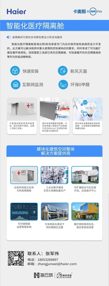 由卡奥斯COSMOPlat联合生态资源共建的智慧医疗隔离方舱,不仅具有高效杀菌、智能互联作用,还能抗风抗震、储能一体,适用于各地不同场景。