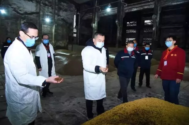 △泸州老窖股份有限公司党委书记、董事长刘淼(中)等公司领导对国窖车间的生产安排、窖池出酒、母糟发酵情况进行详细检查