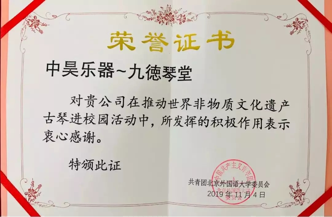 11月,北京外国语大学举行“推动世界非物质文化遗产——古琴进校园”活动,中昊主动提供古琴助力该活动开展。