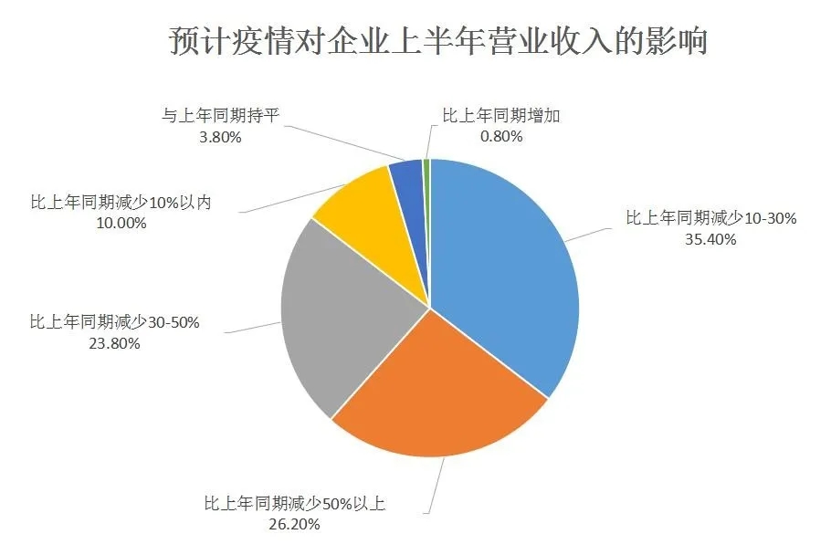 参与调研的企业中,认为疫情对企业未来发展的影响持续在三个月的有48家,占比20.40% 。另有56.4%的企业表示,订单累积,采购空窗,资金紧张,出口受阻,人员缺失等造成的影响,至少需要半年以上的时间来消化。