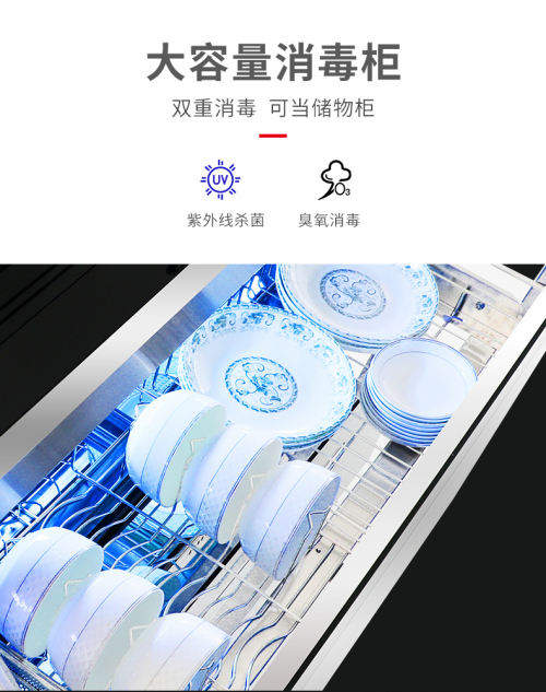 消毒柜的核心作用便是杀菌,而火星一号集成灶的消毒柜采用的是紫外线+臭氧的消毒原理,双管齐下。可有效杀灭乙肝病毒、大肠杆菌等顽固型病毒。同时它还拥有烘干功能,有效将餐具上的水分和异味除掉,以防止细菌滋生。