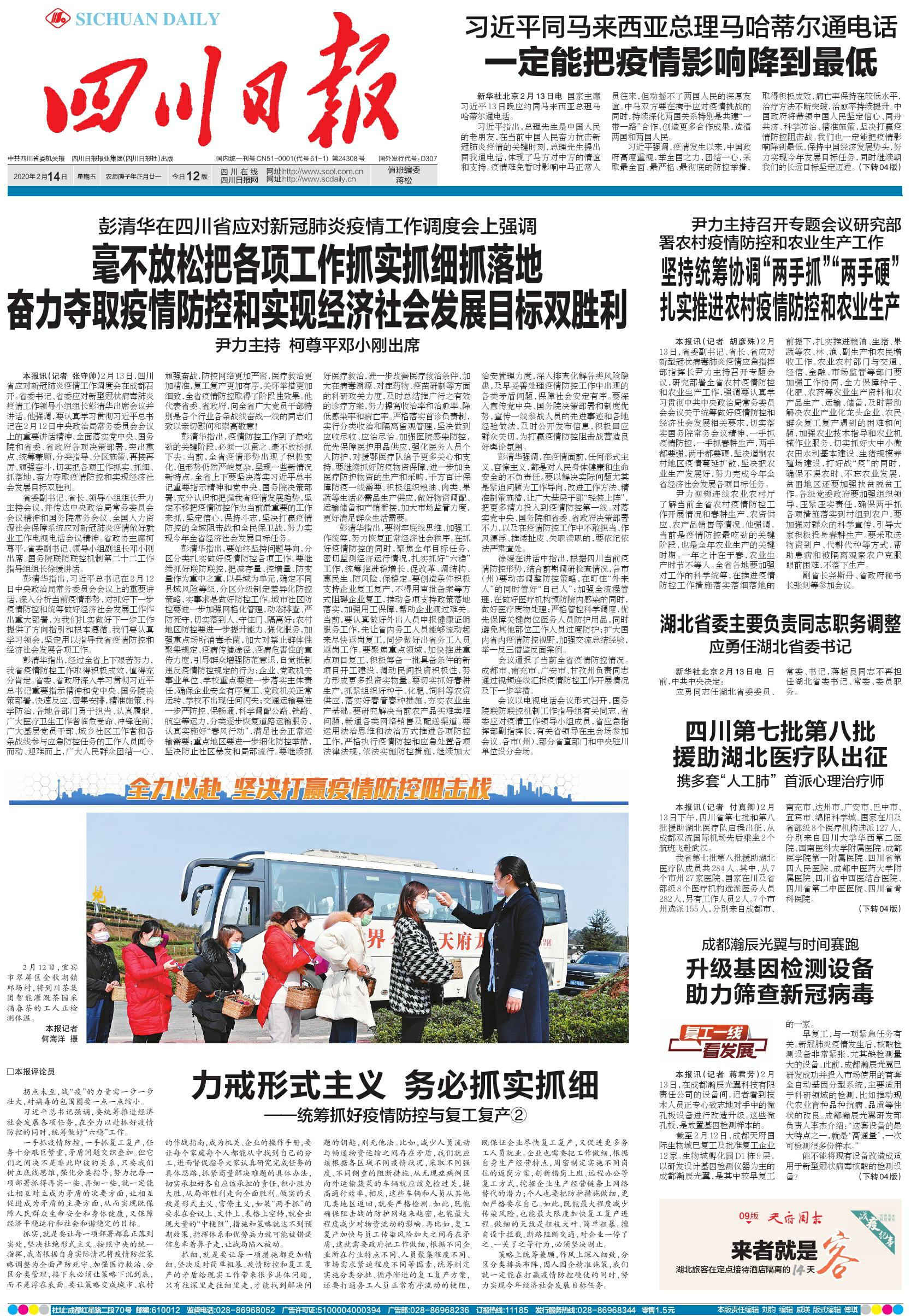 四川日报2月14日头版新闻(图/川茶集团智能灌溉茶园采摘春茶的工人在上山采茶前测量体温)