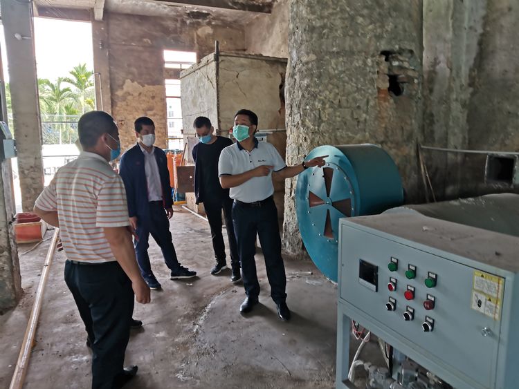 图为:在白马岭茶叶加工厂督导柴火改为液化气技改项目落实情况。