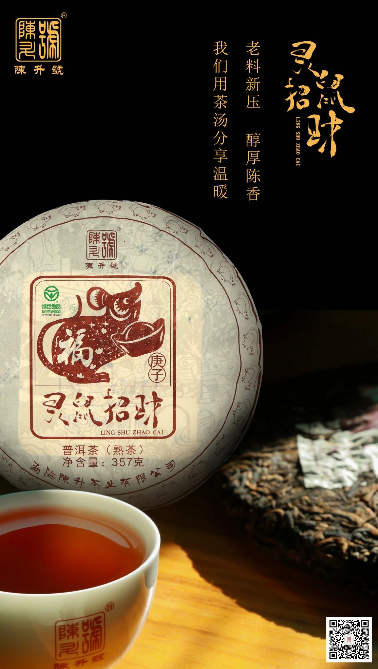 老料新压,醇厚陈香,我们用茶汤分享温暖!灵鼠招财(熟茶)——敬请期待!