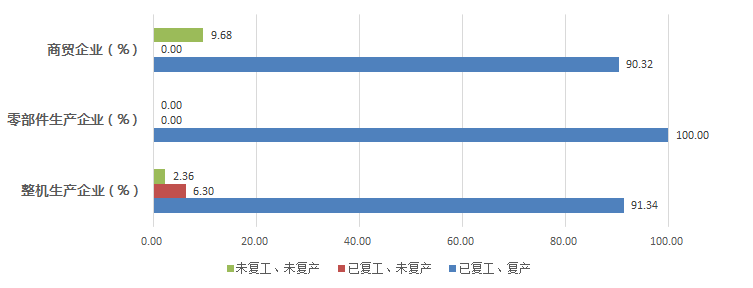 从反馈信息来看,在统计范围内,当前企业复工率达93.53%,比上期提高2.34个百分点;人员返岗数量增加了近5000人,人员返岗率达84.01%,比上期提高2.60个百分点;产能提升至66.49%,较上期提高3.32个百分点,缝制机械企业复工复产稳步推进。现将反馈信息汇总如下:在所有调研企业中,有93.53%的企业已经复工,复工人数占正常生产情况下用工人数的84.01%,企业产能平均恢复至66.49%,企业复工复产情况好转,行业生产逐渐步入正常轨道。另外,有6.47%的企业由于人员尚未返岗、规避疫情风险、政府限制开工、等待复工审批、招工难订单少等原因暂未复工。从企业类型来看(图1),在统计范围内,整、零制造企业复工步伐加快,复工率高于商贸企业。整机企业有91.34%已复工复产,较上期提高1.02个百分点;零部件企业已全数复工复产,较上期提高2.70个百分点。所调研31家商贸企业中,大多数企业都在三月初开始复工,目前尚有9.68%的企业尚未复工。