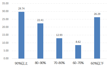 随着人员返岗率的较快提升,上游供应链逐步复工复产,当前行业企业生产基本全面步入正轨。在统计范围内,行业整体产能恢复到66.49%(图4)。其中,产能恢复70%的企业占比提升至65.09%,产能恢复处于60%以下的企业占比仅26.29%。29.74%的企业产能恢复已经超过90%。
