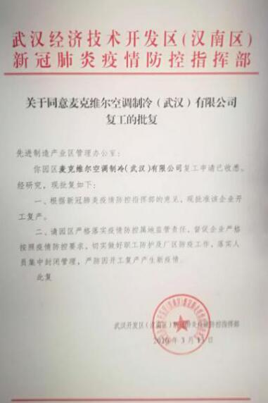 好消息!麦克维尔空调制冷(武汉)有限公司有序复工