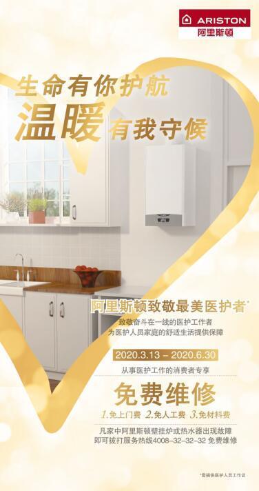 对内,阿里斯顿对员工和经销商真切的关心和帮助,撑起了复工复产的一把保护伞;对外,阿里斯顿扛起企业的责任与担当,为所有的医护人员,我们的英雄和白衣天使,每一位可敬的逆行者,传递关爱和温暖。2020年3月13日到2020年6月30日,阿里斯顿全国范围内启动生命有你护航,温暖有我守护的医护人员关爱行动。全国所有医护工作者,家中的阿里斯顿壁挂炉或热水器出现产品故障,凭有效证件(医师证、护士证)拨打阿里斯顿全国服务热线4008-32-32-32即可预约免费维修服务(免上门费,免人工费,免材料费)。医护人员在此次疫情中守护了全国人民的健康,在他们的背后,阿里斯顿愿用真切的关怀与实际行动守护好他们的温暖和舒适。