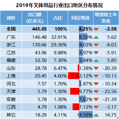2019年,全国文教体育用品制造业累计完成出口额445.05亿美元,同比增长4.25%,增速比上年下降2.58个百分点,比同期轻工业出口增速低1.14个百分点。