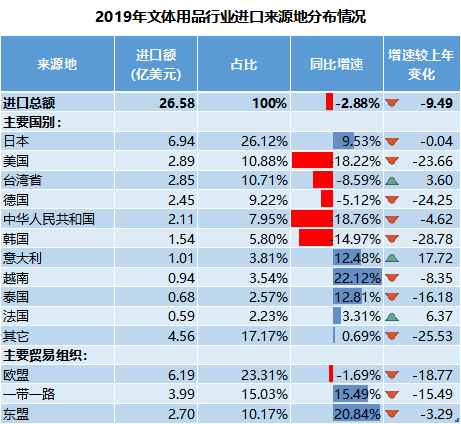 2019年,全国文体行业进口主要来源国为日本、美国、台湾省、德国、中国、韩国、意大利、越南、泰国、法国等国家和地区。自以上10国进口占比近83%。自第一大来源国日本进口占比26.12%,同比较快增长9.53%。其他主要国别中,自美国、台湾、德国、中国、韩国进口均有较大幅度下降,自意大利、越南、泰国进口实现快速增长。从增速变化看,除台湾、意大利、法国外,自其他国家和目的地进口增速较上年均有下降。主要贸易组织中,自一带一路国家和东盟进口分别大幅增长15.49%和20.84%,自欧盟进口下降1.69%。