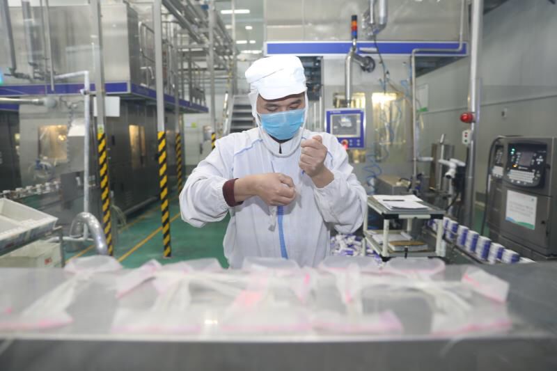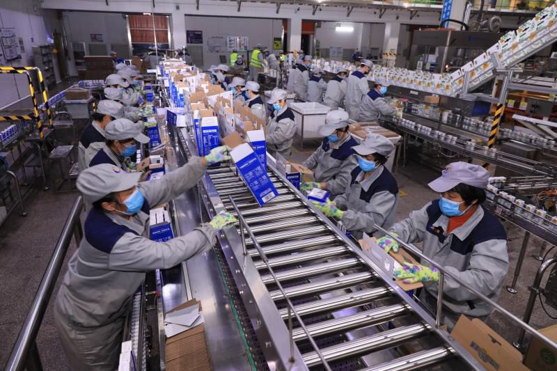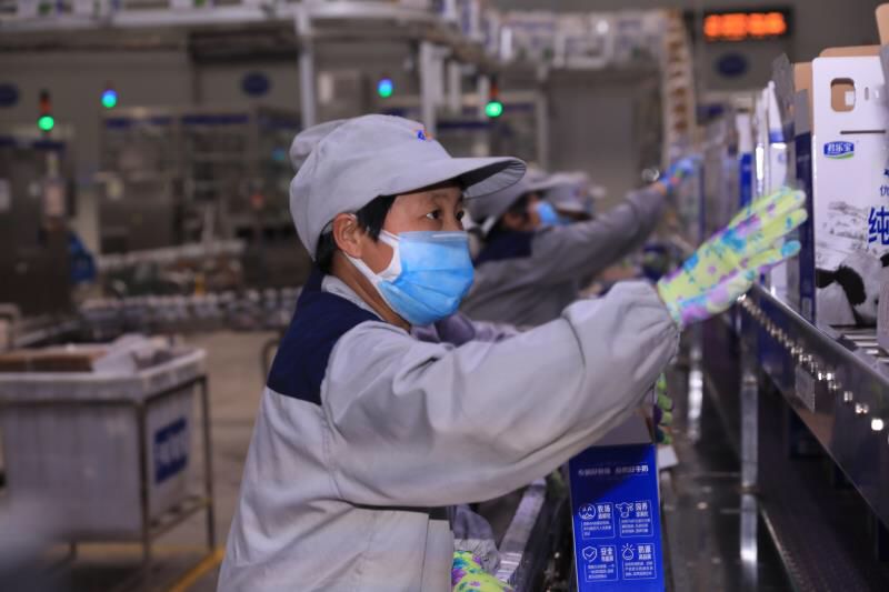 3月3日,位于丰县开发区的江苏君乐宝乳业有限公司,工人们在奶制品生产包装流水线上紧张作业。目前该公司已开启18条生产线,复工率达100%,产品日产量达200吨。