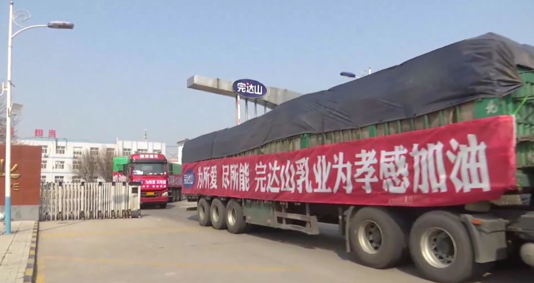 现场,4辆卡车上挂着写有“为所爱 尽所能”口号的条幅,口号同时也是完达山贝乳公司在疫情防控期间执行的工作基调。完达山贝乳公司总经理张英俊接受采访时说,“希望这批牛奶早日到达疫区,为疫区人民抗击疫情出一份力。”并表示,已经在保障员工安全的前提下恢复生产,推动产品稳定供应。