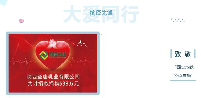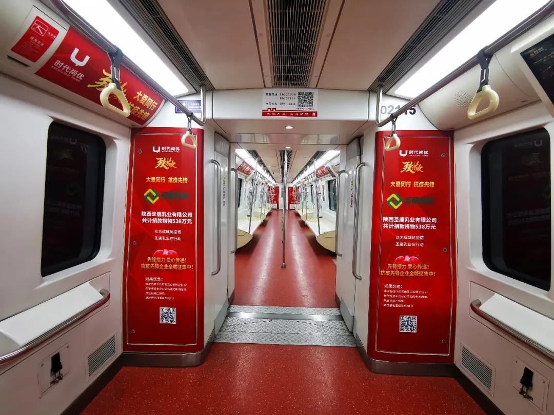 目前,新冠病毒感染的肺炎疫情正在全世界蔓延,自中国疫情爆发以来,社会各界一心、共同打响了这场抗“疫”战争。2月中旬,为向在抗“疫”战争中积极行动的爱心企业致敬,西安时代尚优传媒集团携手陕西省慈善协会,捐赠8列西安地铁2号线列车广告资源,用于“大爱同行 抗疫先锋”公益专列免费宣传。陕西圣唐乳业有限公司因为在疫情防控期间的优异表现,获批在西安地铁2号线0205、0211列车组五号车厢进行抗击疫情的公益展播。