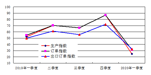 2020年一季度,生产指数为25.0,环比2019年四季度下降62个百分点,同比去年一季度指数下降27.3个百分点。新订单指数为31.3,环比去年四季度下降55.8个百分点,同比去年一季度下降23.5个百分点;其中国外订单指数为32.6,同比2019年一季度下降17.4个百分点。生产指数和订单指数均远低于临界点50,且同比均大幅下降,表明今年一季度受新冠肺炎疫情影响严重,我国体育健身器材制造行业经济急速萎缩。