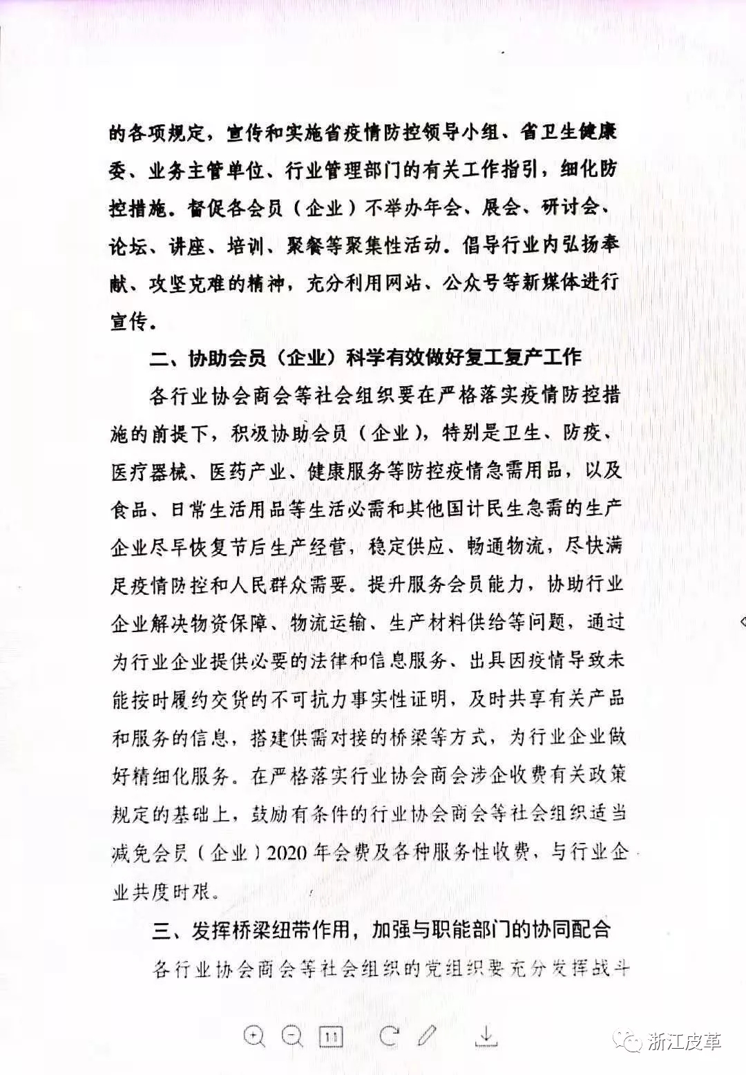 浙江省皮革行业协会要求全省各地地方皮革行业协会商会积极响应浙江省民政厅号召行业协会商会等社会组织参与疫情防控和复工复产倡议书,落实各项倡议举措,在各地疫情防控和复工复产两手抓的关键时刻,按照当地党委和政府有关规定,指导督促和帮助企业按照规定做好复工复产、疫情防控和安全生产工作。发挥桥梁作用,积极与政府沟通,帮助企业解决困难。