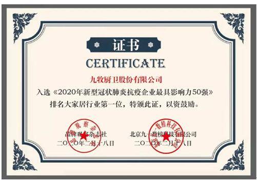 2月20日,《2020年新型冠状肺炎抗疫企业最具影响力指数报告》正式发布,该报告由品牌观察、九一数榜和人民日报民生周刊联合发布。九牧与腾讯、阿里巴巴、蒙牛等荣登榜单,位居家居行业第一,入选2020年新型冠状肺炎抗疫企业最具影响力50强。 详细
