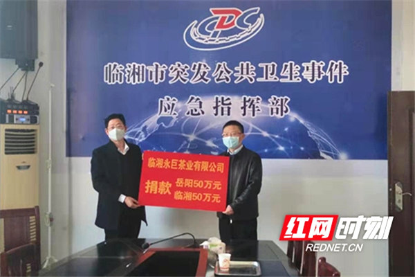 2月12日下午,在岳阳临湘市突发公共卫生事件应急指挥部办公室里,临湘永巨茶业有限公司分别向岳阳红十字会和临湘红十字会捐款50万元,共计捐出100万元。 详细