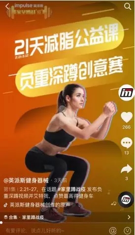 这是青岛英派斯健康科技股份有限公司(以下简称“英派斯”)在抖音上举办的负重深蹲创意赛。在为期21天的比赛中,网友只需在抖音发布负重深蹲视频、@英派斯健身器械(英派斯健身器械抖音官方账号),并加话题#家里蹲战疫#即可参赛,还有机会获得高额奖品。 详细