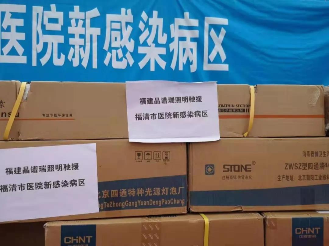 2月4日,福建晶谱瑞照明灯饰有限公司驰援福清市医院新感染病区,捐赠240套杀菌消毒设备,为福建福清市修建疫情隔离应急保障中心贡献一份力量。