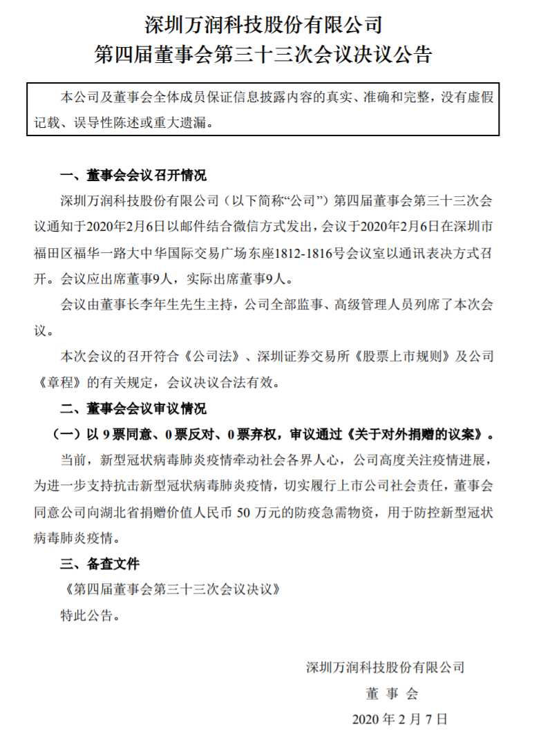 据万润科技公告显示,26日,深圳万润科技股份有限公司召开了第四届董事会第三十三次会议决议,会议上审议通过了《关于对外捐赠的议案》,董事会同意向湖北省捐赠价值人民币50万元的防疫急需物资,用于防控新型冠状病毒肺炎疫情。