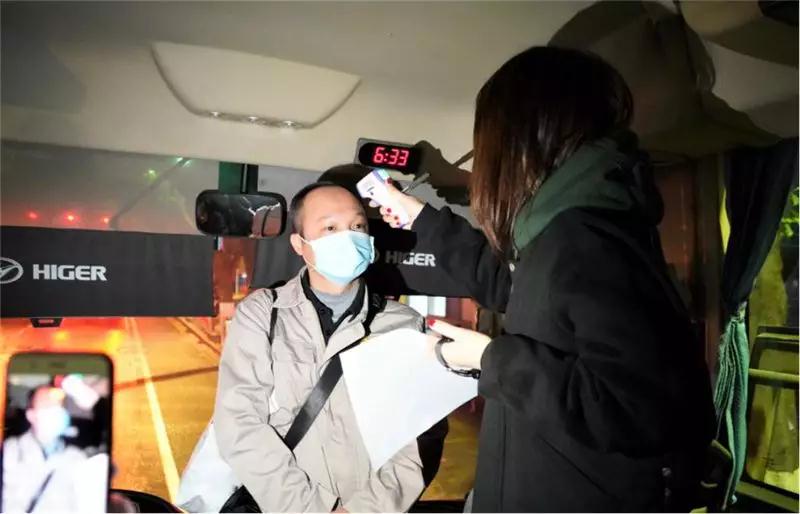 ▲疫情防控党员突击队成员为乘坐班车员工测体温