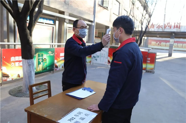 当天,在西凤集团公司大门、生产门及车间大门设置有三道检测“关口”,员工凭上班通勤证、身份证和生活IC卡经测量体温并登记后方可以进入生产岗位。各车间按照防控要求,设置专人负责消毒防护和体温检测,并要求全员全程佩戴口罩,分区域休息,私人物品定点分开摆放,工作餐采取盒饭分散就餐,最大限度减少人员接触聚集。