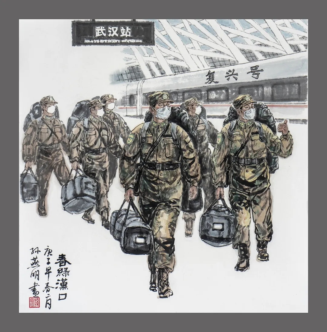 《春绿汉口》,表现了解放军医疗队乘高铁抵达汉品站的武汉抗疫支援行动,还是在关键时刻人民子弟兵勇挑重担,守护人民生命安全和身体健康。用水墨勾线然后染色的技法。特别是从布局上远景至近景呈S形构图,重点空出了前面两个军人的威武形象。