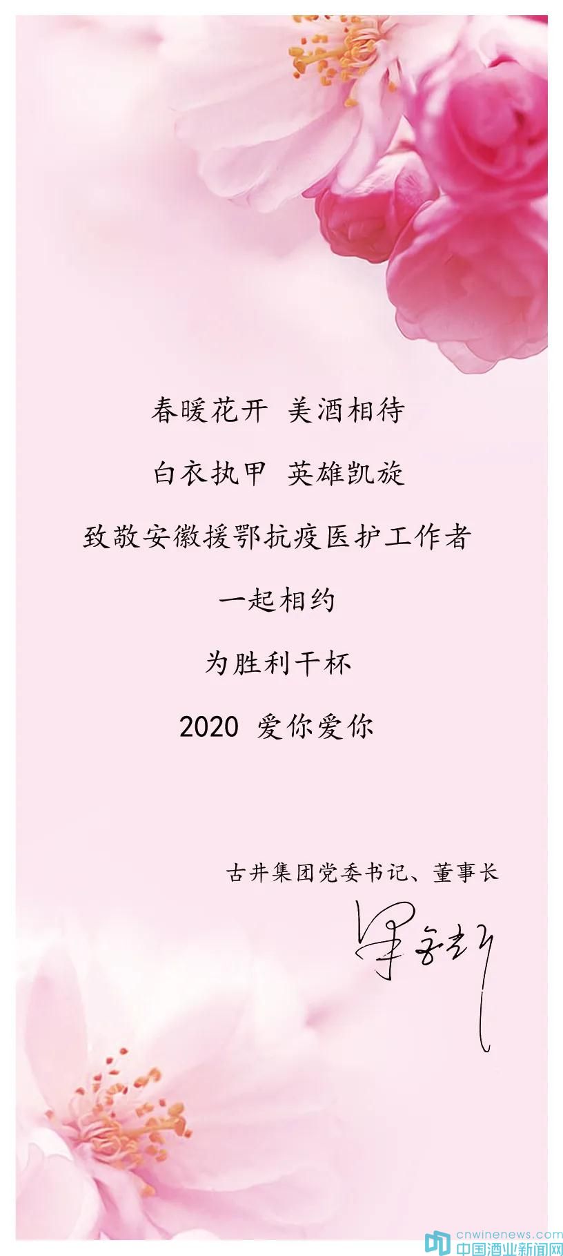 一句祝福语、一段暖心话!古井集团党委书记、董事长梁金辉送上了签名的祝福卡,向援鄂战士表达崇高敬意和诚挚谢意!