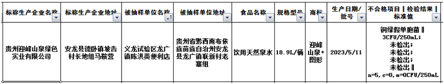 据信用中国,贵州迎峰山泉绿色实业有限公司2023年5月11日生产的饮用天然泉水经重庆海关技术中心检测,铜绿假单胞菌项目不符合GB 19298-2014《食品安全国家标准 包装饮用水》要求、DBS52/ 008-2015《食品安全地方标准 饮用天然泉水》要求,2023年8月31日,贵州省黔西南州兴义市市场监督管理局对该公司罚款1万元。
